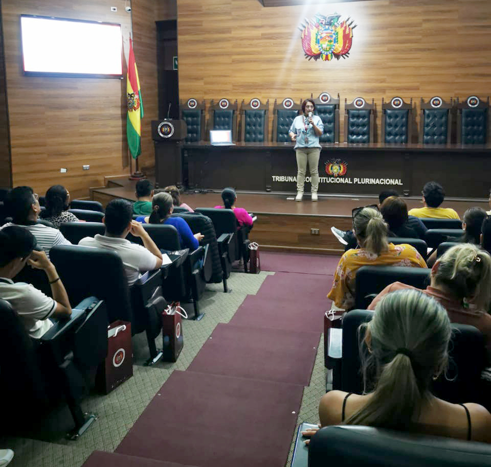 Dicha actividad, efectuada el martes 26 de noviembre del presente año y desarrollada en el Salón de Honor del TCP, contó con la participación de alrededor de 40 integrantes de la comitiva estudiantil. A propósito de ello, Gery Rojas, Director de la Academia Plurinacional de Estudios Constitucionales (APEC), en representación del Presidente Hurtado, fue el encargado de brindar la bienvenida a las y los universitarios, enfatizando la alegría con la que esta institución, guardiana férrea de los Derechos Humanos en Bolivia, recibe a las nuevas generaciones de abogadas y abogados de todos los rincones del país.