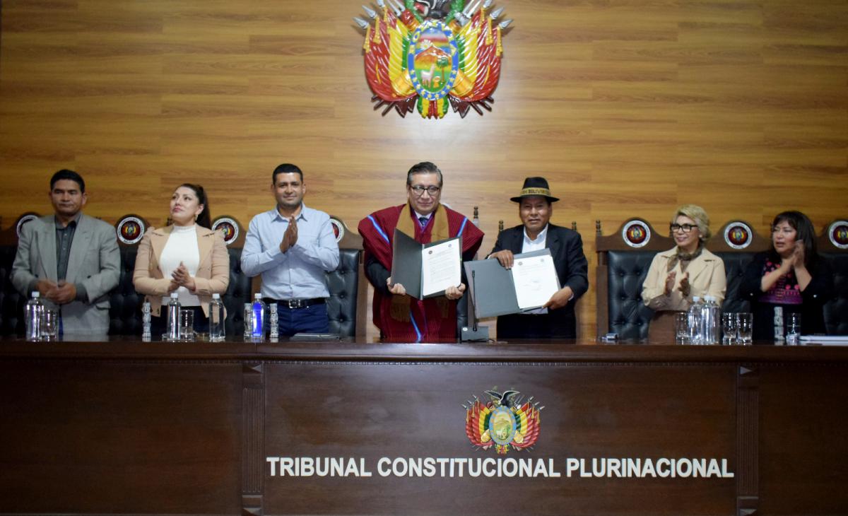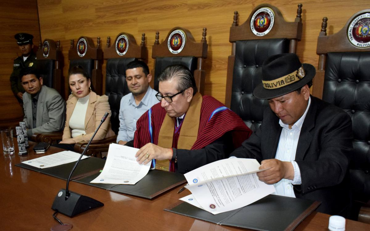 El Tribunal Constitucional Plurinacional (TCP), a la cabeza de su Presidente Gonzalo Miguel Hurtado Zamorano y la Federación de Asociaciones de Municipios de Bolivia (FAM) representada por Flavio Merlo Maydana, suscribieron un convenio de cooperación interinstitucional el día jueves 12 de diciembre del año en curso, en el marco de la realización de un emotivo Acto en el Salón de Honor del TCP, de la ciudad de Sucre.
