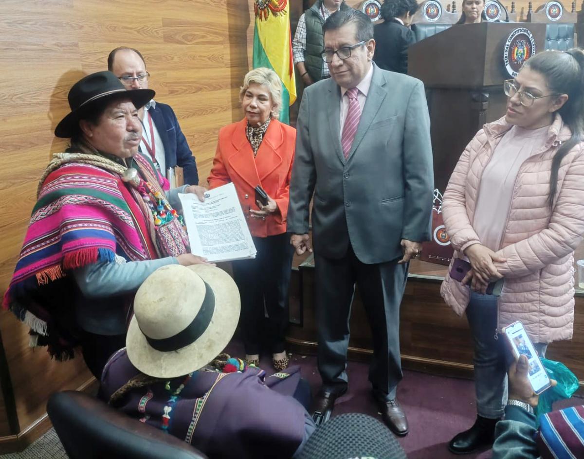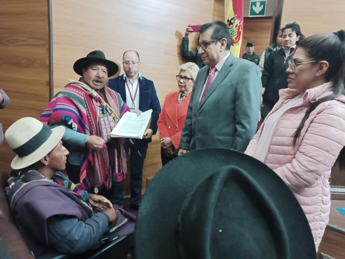 El Dr. Gonzalo Hurtado Zamorano, Presidente del Tribunal Constitucional Plurinacional (TCP), en compañía de las Magistradas Elizabeth Cornejo e Isidora Jiménez, se reunieron en el Salón de esta institución con los comunarios de la Nación Qhara Qhara de Potosí, e hicieron la entrega simbólica de una sentencia constitucional que responde a las necesidades reales de este pueblo indígena. El mismo fue notificado debidamente y por la vía regular a través de ventanilla, minutos más tarde.