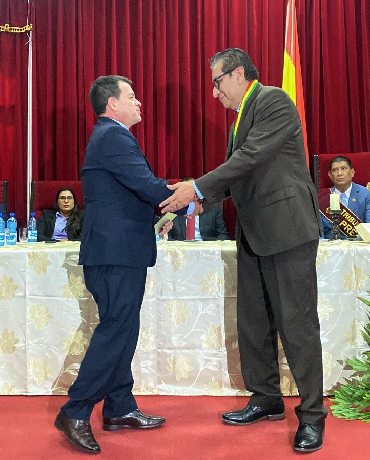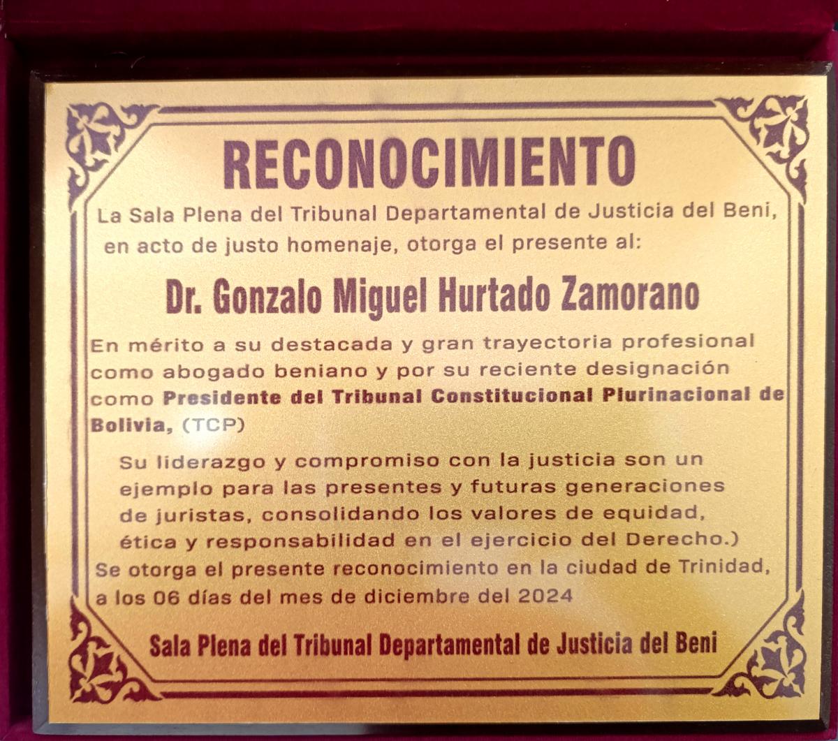 El Presidente del Tribunal Constitucional de Bolivia, Gonzalo Miguel Hurtado Zamorano, recibió un Galardón muy especial por parte de la Sala Plena del Tribunal Departamental de Justicia del Beni, representada por su Presidente saliente, Roberto Ismael Nacif Suárez.