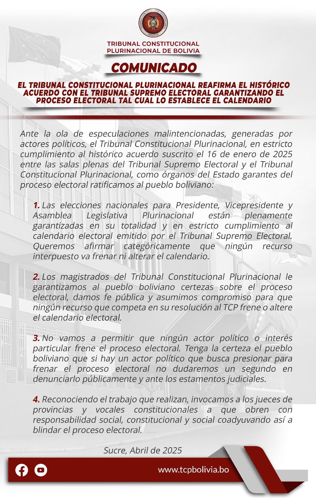 COMUNICADO Publicación de la entrada:24 de abril de 2025 Categoría de la entrada:Noticias Etiquetas: Noticias Leer más artículos Entrada anteriorTRIBUNAL CONSTITUCIONAL PLURINACIONAL PRESENTA NUEVO SITIO WEB Y LLEVA ADELANTE SEMINARIO EN TARIJA Siguiente entradaTRIBUNAL CONSTITUCIONAL PLURINACIONAL PRESENTA INFORME DE RENDICIÓN PÚBLICA DE CUENTAS – INICIAL 2025 También podría gustarte Magistrado Espada participó de los actos protocolares en Pando 24 de septiembre de 2018 COMUNICADO 30 de agosto de 2023 CONCLUYE CON ÉXITO EL IV CONGRESO INTERNACIONAL DE DERECHO PROCESAL CONSTITUCIONAL DEL TCP 9 de octubre de 2022