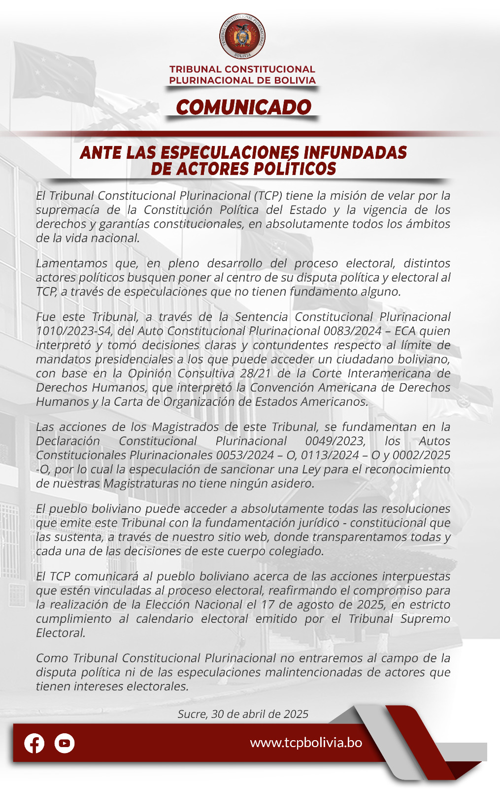 COMUNICADO Publicación de la entrada:30 de abril de 2025 Categoría de la entrada:Noticias Etiquetas: Noticias Leer más artículos Entrada anteriorTRIBUNAL CONSTITUCIONAL PLURINACIONAL PRESENTA INFORME DE RENDICIÓN PÚBLICA DE CUENTAS – INICIAL 2025 Siguiente entradaCONFERENCIA DE PRENSA – Magistrado Decano René Yván Espada Navía También podría gustarte TCP difunde y socializa su labor en impartición de Justicia Constitucional en el Municipio de Independencia 20 de abril de 2021 DÍA NACIONAL DEL AGUA Y SANEAMIENTO 28 de octubre de 2020 TCP organizó Conferencia: “Concepciones sobre la Teoría del Derecho” 20 de julio de 2018