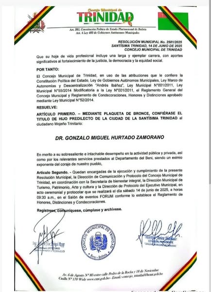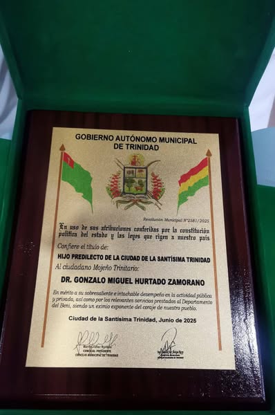 El Concejo Municipal de Trinidad, mediante Plaqueta de Bronce, confirió el Título de Hijo Predilecto de la Ciudad de la Santísima Trinidad al Presidente del Tribunal Constitucional Plurinacional (TCP), Gonzalo Miguel Hurtado Zamorano, en mérito a su sobresaliente e intachable desempeño en la actividad pública y privada, así como por los relevantes servicios prestados al Departamento del Beni, siendo un eximio exponente del coraje del pueblo beniano.