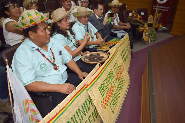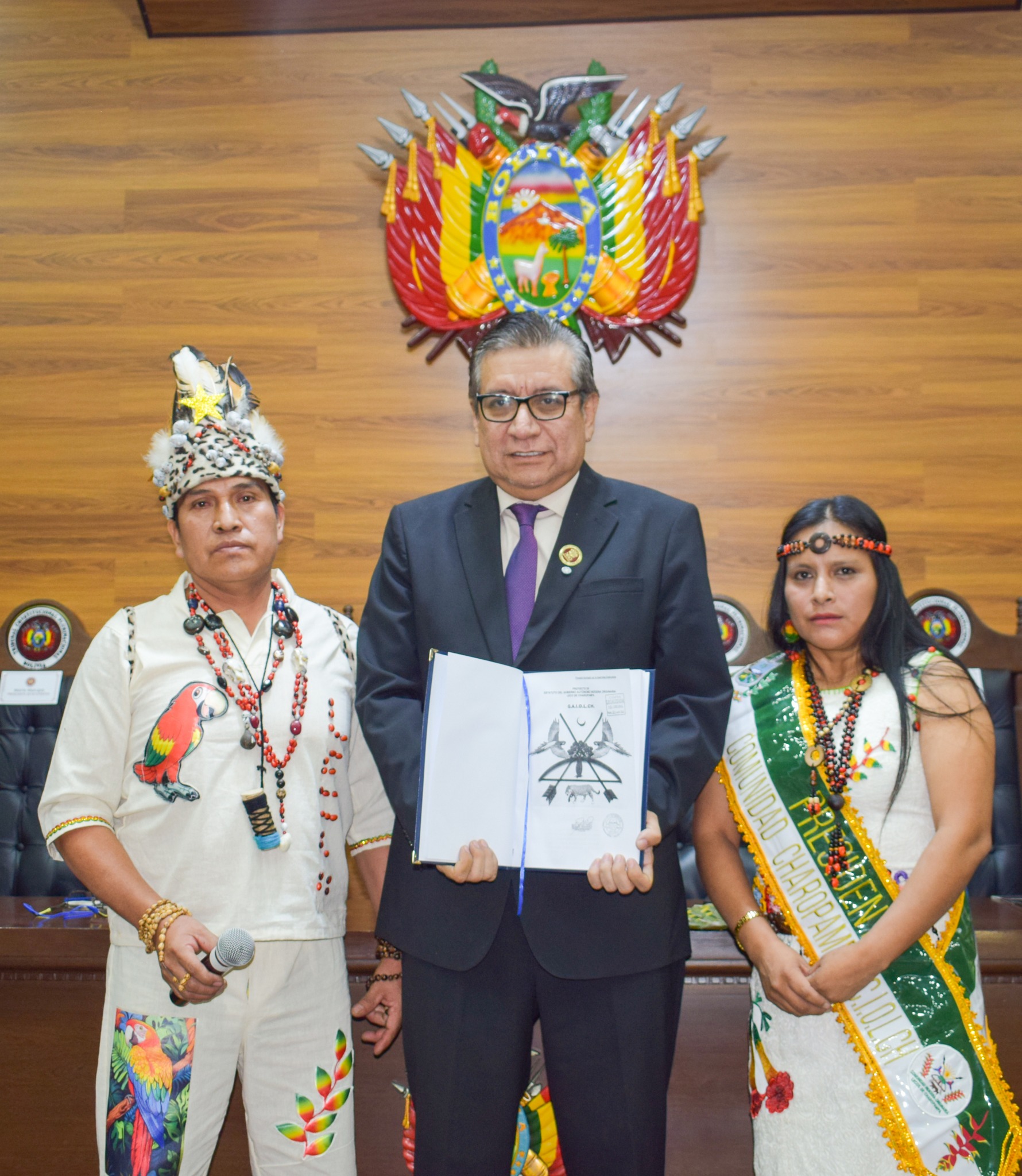 La entrega de este Proyecto del Estatuto Autonómico de la Comunidad de “Lecos de Charopampa” fue encabezada por Fabiola Condori, Presidenta OTB y Mario Marupa, Presidente Estatuyentes, “ vinieron todos nuestros representantes de la comunidad con la esperanza de que el documento que se presenta , traiga mejores días para el pueblo” coincidieron ambas autoridades indígenas.