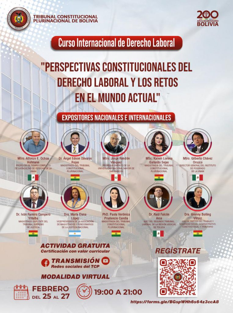 El TRIBUNAL CONSTITUCIONAL PLURINACIONAL DE BOLIVIA (TCP), Invita al Curso Internacional de Derecho Laboral: “PERSPECTIVAS CONSTITUCIONALES DEL DERECHO LABORAL Y LOS RETOS EN EL MUNDO ACTUAL”, con la participación de excelentes expositores nacionales e internacionales. FECHA: 25,26 y 27 de febrero. MODALIDAD: Virtual ACTIVIDAD GRATUITA Inscríbete en el siguiente link de Inscripción |